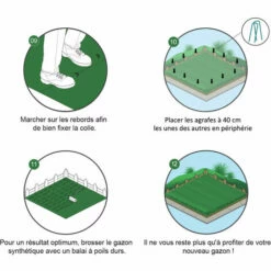 Ce gazon peut ĂŞtre utilisĂ© au jardin ou sur sol dur (contour de piscine, terrasse, balcon). Pour le jardin, vous aurez besoin pour les extrĂ©mitĂ©s, d’agrafes spĂ©cialement conçus pour la pose de pelouse artificielle ; ainsi que de bandes autocollantes qui sont, elles, utilisĂ©es pour les jonctions (les rĂ©fĂ©rences sont vendues sur notre site).