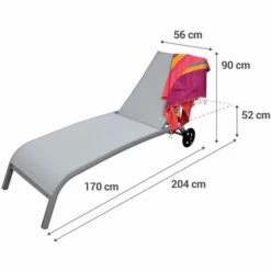 Bain de soleil en aluminium design, très confortable et pratique avec ses roulettes et son dossier inclinable.