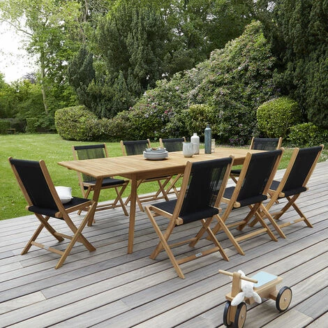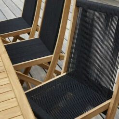 Salon de jardin en corde et teck composĂ© d’une table rectangulaire extensible et de 8 chaises.