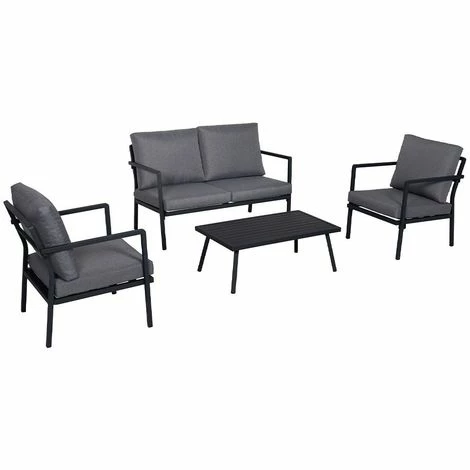 Ce salon de jardin en aluminium se compose d’un canapĂ©, de deux fauteuils et d’une table basse. Moderne et très confortable, il trouvera facilement sa place dans votre jardin.