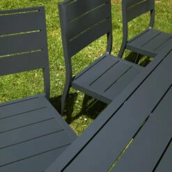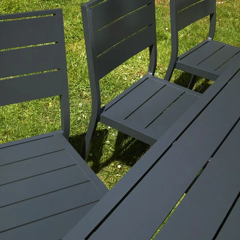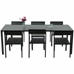 Salon de jardin design et Ă©lĂ©gant pour profiter pleinement de vos repas en extĂ©rieur. Il se compose de six chaises et d’une table.