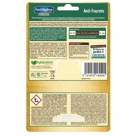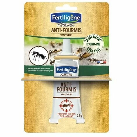 Anti fourmis tube 25g /nc de la marque FERTILIGENE. MolĂ©cule d’origine vĂ©gĂ©tale : Ă€ base d extraits de plante de la famille des AstĂ©racĂ©es (Chrysanthemum cinerariaefolium). Elimine radicalement toute la fourmilière et les fourmis noires des jardins,aux abords de la maison, sur les balcons, terrasses et dallages.