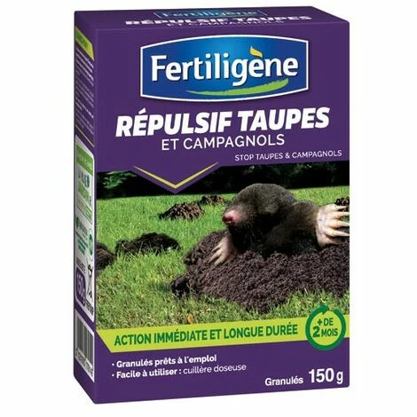 Anti taupes/campagnols granulĂ©s PAE 150g /nc de la marque FERTILIGENE. EfficacitĂ© immĂ©diate. Action longue durĂ©e : + de 2 mois. Jusqu’Ă 78 jours pour les taupes et 85 jours pour les campagnols. A base d’huile d’eucalyptus citronnĂ©. Facile Ă utiliser : cuillère doseuse.