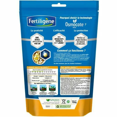 Pratique, une seule application par an. Rapide, des résultats visibles en 7 jours. Sûr, pas de risques de brûlure pour les racines. Convient parfaitement a toutes les variétés de plantes méditerranéennes ainsi que les agrumes cultivées en pots ou en pleine terre. Emballage en plastique recyclé.
