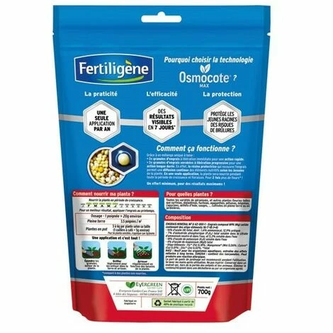 Engrais osmocote fleurs du jardin doypack 700g /nc de la marque FERTILIGENE. Pratique, une seule application par an. Rapide, des rĂ©sultats visibles en 7 jours. SĂ»r, pas de risques de brĂ»lure pour les racines. Emballage en plastique recyclĂ©. Convient parfaitement Ă toutes les variĂ©tĂ©s de gĂ©raniums, et autres plantes fleuries telles que surfinias, dipladĂ©nias, fuchsia, agapanthus, pĂ©tunias, bĂ©gonias, capucines, oeillets d’Inde, sauges, cultivĂ©es en pleine terre ou en jardinières.