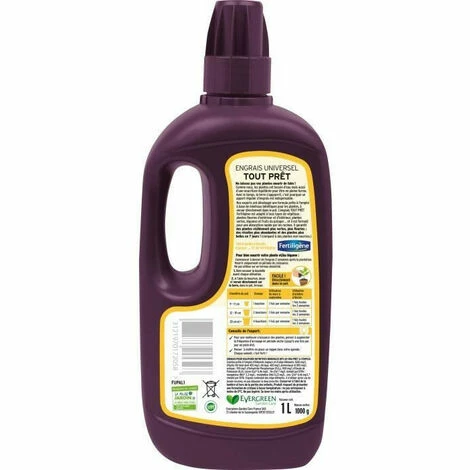 L’engrais TOUT PReT universel Fertiligene est dĂ©ja diluĂ© dans l’eau pour plus de facilitĂ© – La plante est fertilisĂ©e en 1 seul geste – Il est formulĂ© a base de minĂ©raux (magnĂ©sium, fer, manganese,…) bĂ©nĂ©fiques pour les plantes et rapidement assimilable par les racines – Il est adaptĂ© a tous types de fleurs, fruits et lĂ©gumes et apporte une nourriture Ă©quilibrĂ©e pour une floraison et des rĂ©coltes visiblement plus abondantes ainsi que des plantes plus belles en 7 jours (comparĂ© a une plante non nourrie) – Informations rĂ©glementaires : Engrais universel Pret a l’emploi Engrais pour solutions nutritives minĂ©rales NF-U 42-004 – Engrais NPK Pret a l’emploi 0,16-0,07-0,11.